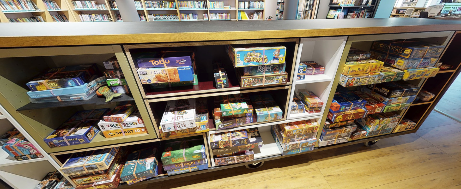Nur die Logik- und Denkspiele sind bei uns extra, weil auch danach immer wieder explizit gefragt wurde. In demselben Regal sind jetzt auch die Escape- und Exit-Spiele untergebracht.