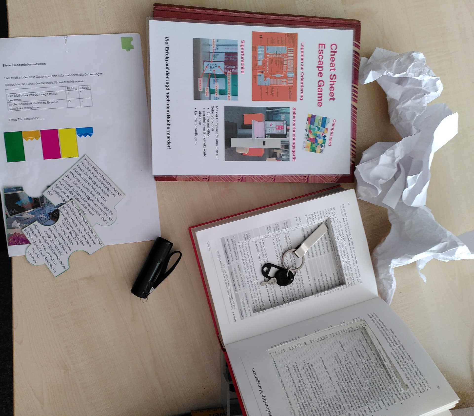 wir verteilen vor dem Spiel die Materialien, die gefunden werden müssen, in der Bibliothek und versucht, falsche Hinweise zu entfernen (Wenn im Kopierraum ein vergessenen Blatt oder ein vergessener USB-Stick liegen, wurde beides schon als Teil des Rätsels interpretiert, das irgendwie Sinn ergeben muss ) . Das dauert ca. 20 Minuten. Nach dem Spiel suchen wir die Materialien wieder zusammen, viele werden von der Rätselgruppe aber mitgenommen und am Ende abgegeben.