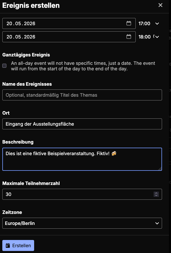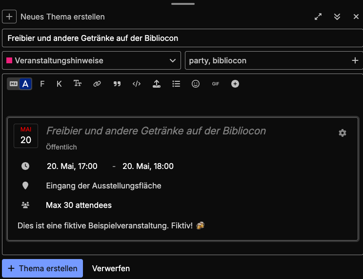 Ist man damit einverstanden, kann man das mit “Thema erstellen” veröffentlichen. Nun sollte auch diese Veranstaltung im Kalender auftauchen.