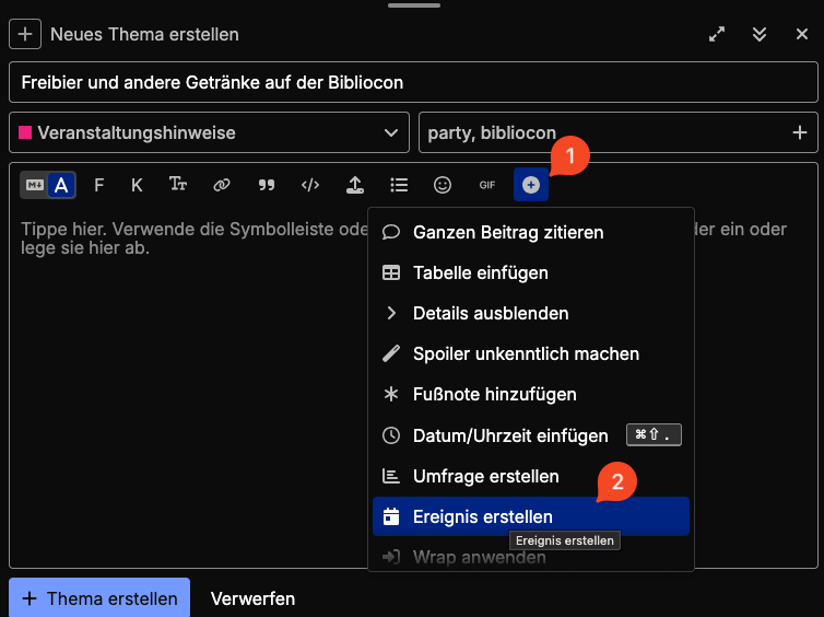 Im sich öffnenden Editor Titel eintragen und idealerweise auch die korrekten Schlagwörter. Dann im Menü hinter dem “+” den Punkt “Ereignis erstellen” auswählen.