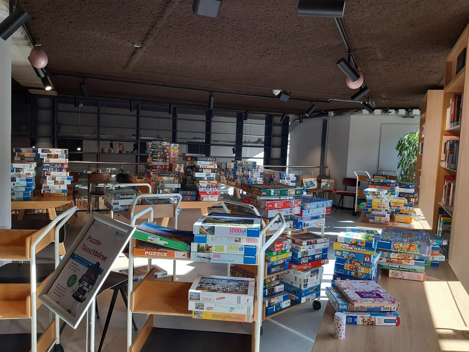 Guten Tag, die Stadtbibliothek Aachen hat dies ganz einfach gestaltet. Auf einem Tisch im Eingangsbereich ist eine Tauschmöglichkeit geschaffen worden. Mit kurzem Hinweis: Puzzle Tausch Tisch.